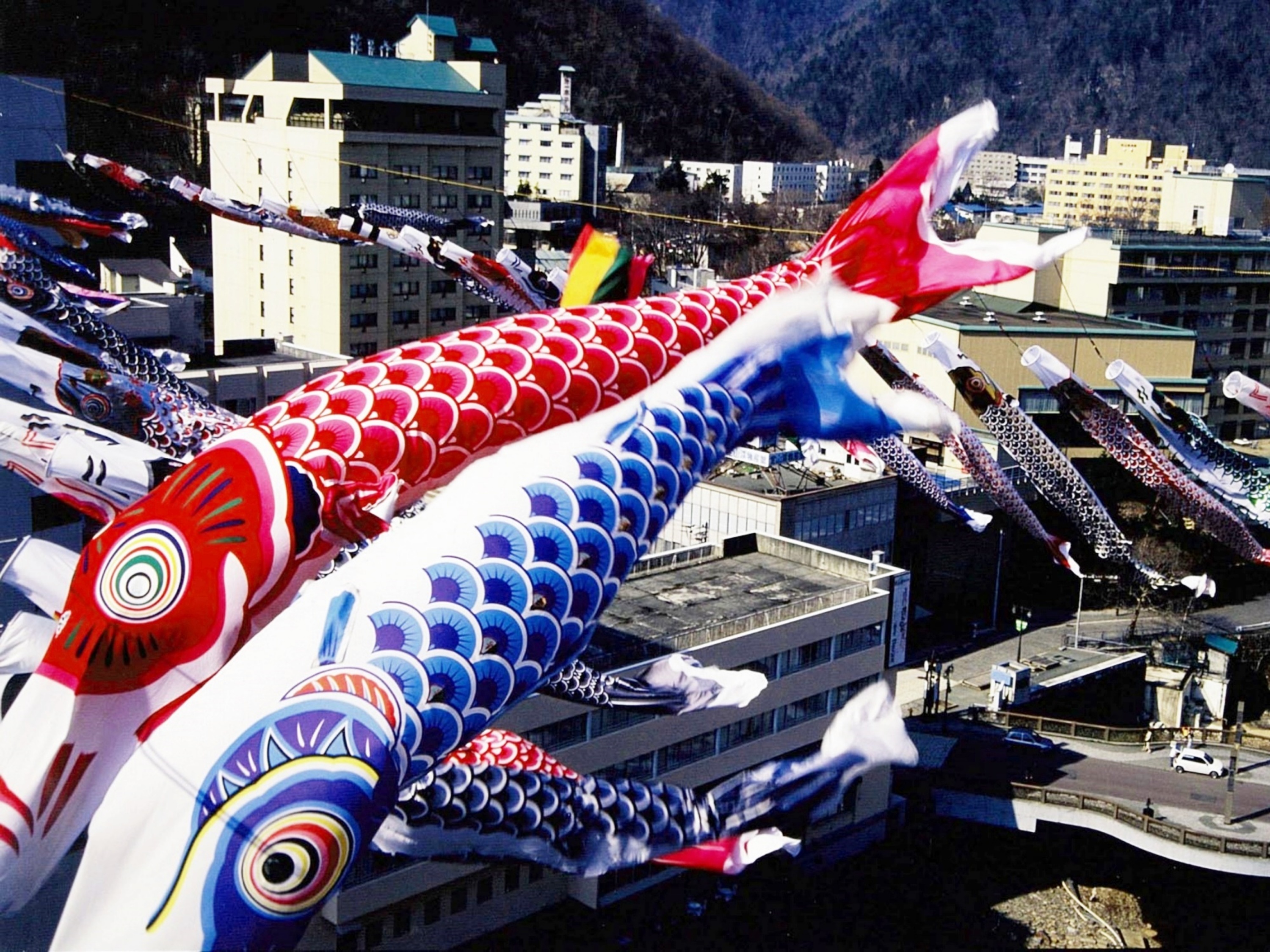 色とりどりの鯉たちが春風を受け、渓谷を背景に泳ぐ姿は定山渓ならではの圧巻の光景です。
