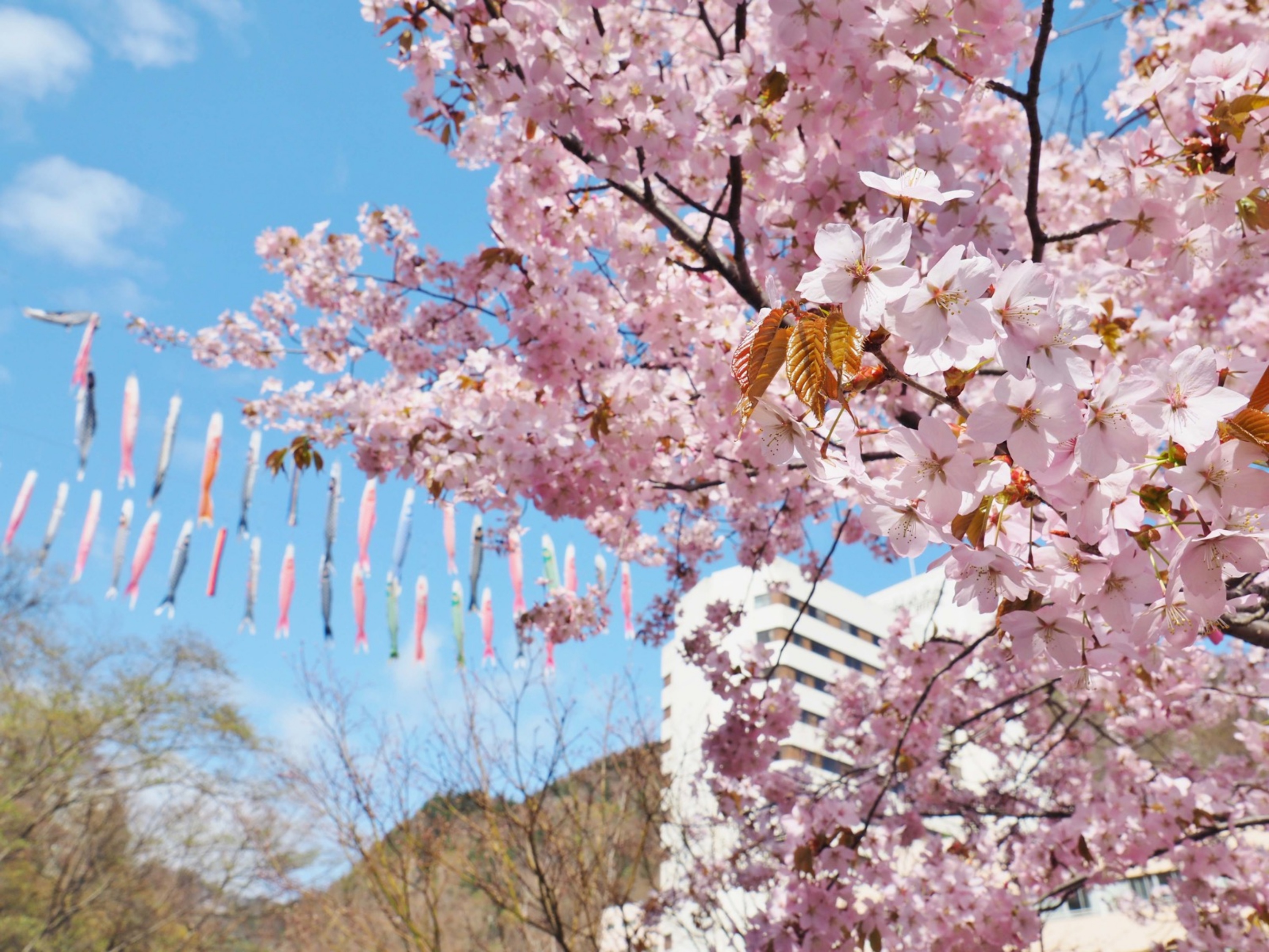 山々に残雪が輝く4月から、瑞々しい新緑が芽吹く5月中旬まで、約400匹の鯉のぼりが温泉街を流れる豊平川の上空を壮大に舞い泳ぎます。